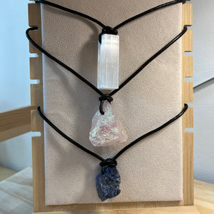 Crafted from animal-friendly vegan leather, this gender-neutral crystal necklace combines elegant style with a conscious mindset, making it ideal for fashion-forward individuals who want to make a statement without compromising their values. Stones: Angel Aura Quartz- Light, serenity and joy Green Fluorite- Healing, Growth and re-energize Selenite- Cleansing, balance, and peace Sodalite- Intuit... read more